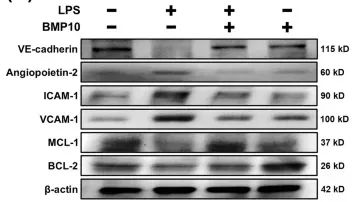 透射电子显微镜(TEM)下,LPS 组小鼠肺内皮细胞膜破损、间隙水肿,肺泡灌洗液(BALF)总蛋白量显著增加(图2A)。BMP10 治疗后,肺内皮细胞膜重归完整,水肿消退,BALF 总蛋白量显著降低。免疫组化染色显示(图2B),LPS 抑制 VE - 钙黏蛋白表达,BMP10 治疗精准逆转这一改变。同时,BMP10 调控 ICAM - 1、VCAM - 1、血管生成素 - 2 表达,让紊乱的内皮细胞黏附与血管生成相关蛋白重归平衡,稳固肺内环境,减少液体渗漏与炎症细胞异常黏附。