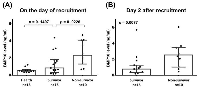 人体样本检测发现,肺炎相关 ARF 患者血浆 BMP10 浓度显著高于健康人群。更关键的是,院内死亡患者在入院当天及次日的血浆 BMP10 水平显著高于幸存者(图4)。这一发现明确 BMP10 是预测死亡风险的潜在生物标志物,为临床早期风险评估、干预时机把握提供关键依据。