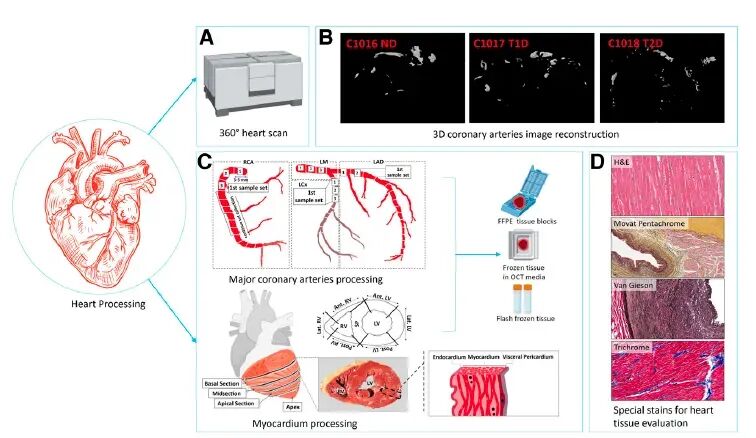 CaRe-T1D构建了包含1型糖尿病、2型糖尿病及无糖尿病器官捐赠者组织的生物样本库,收集的组织包括心脏、肾脏、颈动脉、外周动脉和血液等。心脏处理时,先进行微CT扫描检测血管钙化,再进行系统解剖,制备成多种形式的生物样本,每个捐赠者可产生多达220份心脏(包括冠状动脉和心外膜脂肪)组织aliquots、80份肾脏组织aliquots以及200张带有组织特异性染色的组织切片。同时,该生物样本库有严格的质量控制程序,心肌和主动脉组织的平均RNA完整性数(RIN)为7.8。