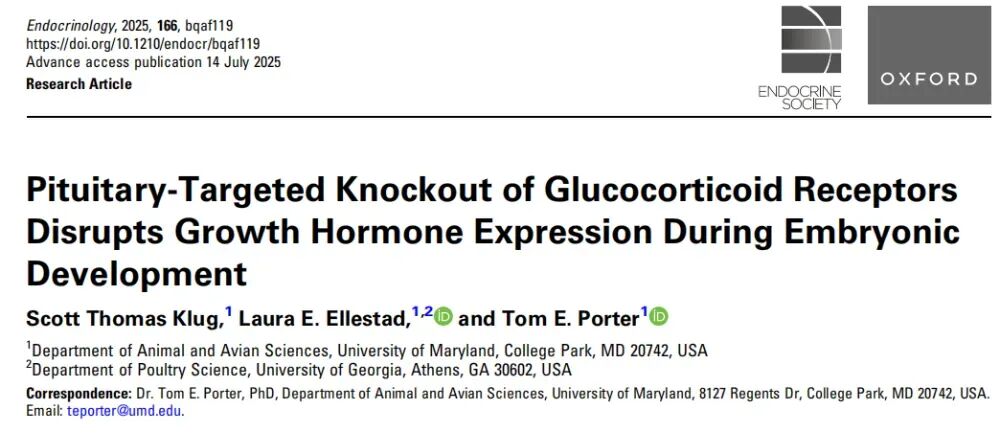 2025年7月,Endocrinology杂志发表了一篇题为“Pituitary-Targeted Knockout of Glucocorticoid Receptors Disrupts Growth Hormone Expression During Embryonic Development”的研究文章,该研究首次通过基因敲除技术,揭示了糖皮质激素受体(GR)在胚胎期对GH表达的调控作用,填补了这一领域的空白。