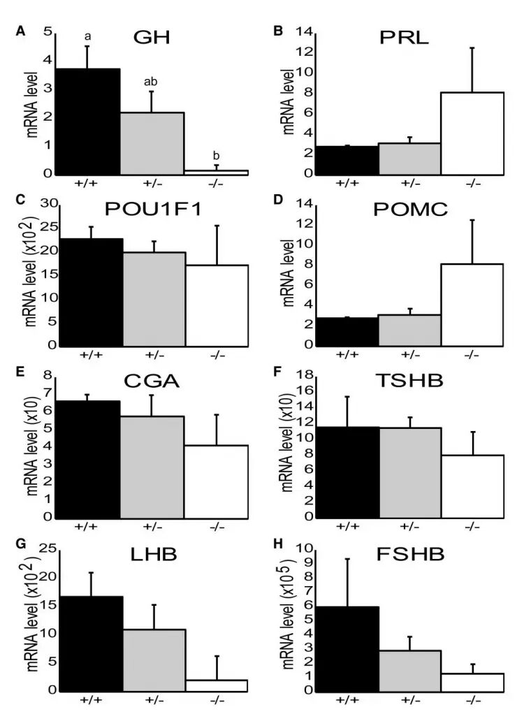 注:垂体取自e17.5/e18.5小鼠(n=11)。通过尾部组织提取DNA,对每个胚胎进行基因分型,包括GR(+/+)(n=3)、GR(+/−)(n=5)或GR(−/−)(n=3)。从所有组织中提取总RNA并进行RT-qPCR分析。数据以均值±标准误(SE)表示。每个基因均进行单因素方差分析(one-way ANOVA),随后使用Tukey事后检验分析差异。不同基因型之间具有统计学显著差异的基因以不同字母标注表示。(a)在GR(−/−)胚胎中,Gh mRNA表达显著下降(P=0.01),相较于GR(+/+)胚胎。GR(+/−)胚胎的Gh表达水平介于两者之间,但与GR(+/+)和GR(−/−)均无显著差异。(b)Prl mRNA表达在任一基因型间均无显著差异。(c)Pou1f1(Pit1)mRNA表达(y轴×10²)在各基因型之间无显著差异。(d)Pomc mRNA表达在各基因型之间无显著差异。(e)Cga mRNA表达(y轴×10)在各基因型之间无显著差异。(f)Tshβ mRNA表达(y轴×10)在各基因型之间无显著差异。(g)Lhβ mRNA表达(y轴×10²)在各基因型之间无显著差异。(h)Fshβ mRNA表达(y轴×10⁵)在各基因型之间无显著差异。