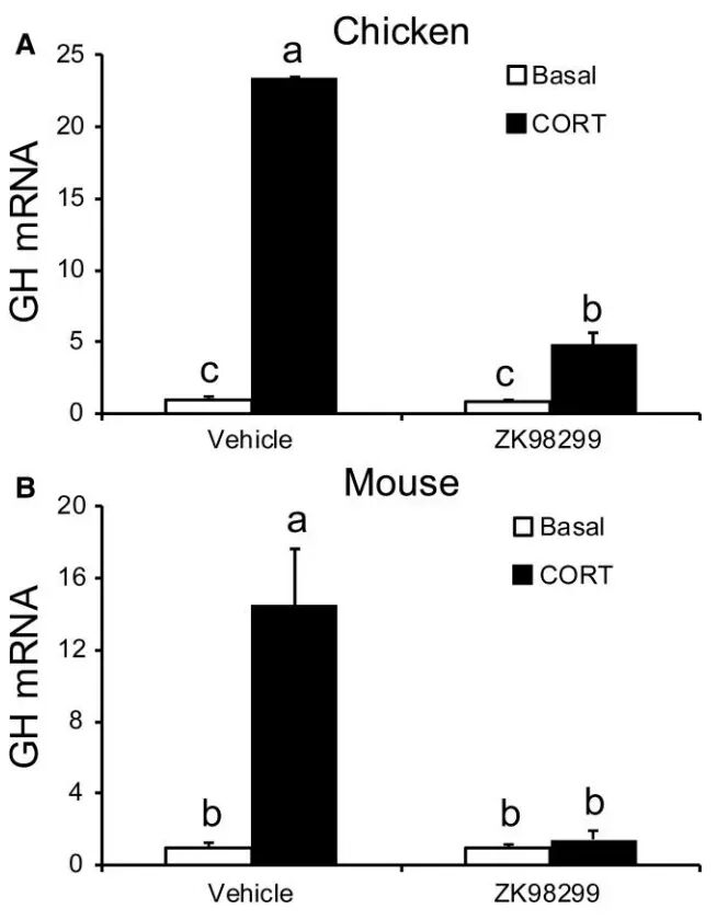 注:所有结果均相对于在基础培养条件下培养的细胞中的Gh mRNA水平进行了标准化。数据显示为3次独立小鼠胚胎垂体细胞实验和2次独立鸡胚垂体细胞实验的均值±标准误差。(a)e11鸡胚生长激素细胞在CORT处理下,分别在有无糖皮质激素受体拮抗剂(ZK98299)存在条件下的Gh mRNA表达。(b)e12.5/e13.5小鼠生长激素细胞在CORT处理下,分别在有无糖皮质激素受体拮抗剂存在条件下的Gh mRNA表达。在每个物种中,统计学显著差异以不同字母标注表示。