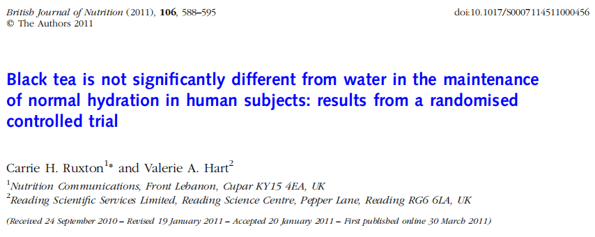 [2]Ruxton CH, Hart VA. Black tea is not significantly different from water in the maintenance of normal hydration in human subjects: results from a randomised controlled trial[J]. Br J Nutr. 2011 Aug;106(4):588-95. Doi: 10.1017/S0007114511000456.