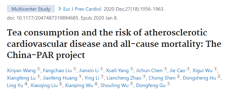[1]Wang X, Liu F, Li J, et al. Tea consumption and the risk of atherosclerotic cardiovascular disease and all-cause mortality: The China-PAR project[J]. Eur J Prev Cardiol. 2020 Dec;27(18):1956-1963. Doi: 10.1177/2047487319894685.