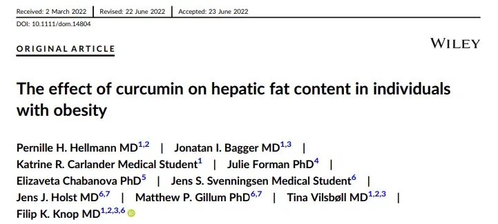 Hellmann PH, Bagger JI, Carlander KR, Forman J,ChabanovaE, Svenningsen JS, Holst JJ, Gillum MP, Vilsbøll T, Knop FK. The effect of curcumin on hepatic fat content in individuals with obesity. DiabetesObesMetab. 2022 Nov;24(11):2192-2202.doi: 10.1111/dom.14804.Epub2022 Aug 11. PMID: 35775631; PMCID: PMC9804166.