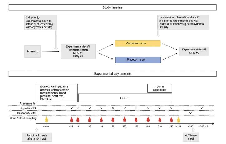 本研究是一项单中心、随机、双盲、安慰剂对照的平行组试验,旨在评估6周姜黄素治疗对肥胖个体肝脂肪含量的影响。研究于2019年4月至2020年12月在丹麦哥本哈根大学根托夫特医院临床代谢研究中心开展,严格遵循《赫尔辛基宣言》及GCP指南,并经丹麦首都地区科学伦理委员会批准(注册号:NCT03864783)。