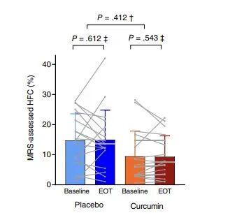研究结果呈现出"主终点失守、次终点微光"的复杂图景。基线时两组匹配良好(平均年龄46岁,BMI 38.8 kg/m²,腰围125.8 cm),但安慰剂组HFC略高(14.7% vs 9.5%)。经过6周干预,主要终点MRS评估的HFC变化令人遗憾:姜黄素组HFC变化为-0.86个百分点(95%CI -3.65; 1.94),安慰剂组为+0.71个百分点(95%CI -2.08; 3.51),两组间估计治疗差异(ETD)为-1.57个百分点(95%CI -5.36; 2.22,P=0.412),差异无统计学意义。作者坦承:"与安慰剂相比,姜黄素治疗6周对MRS评估的HFC无显著影响"。